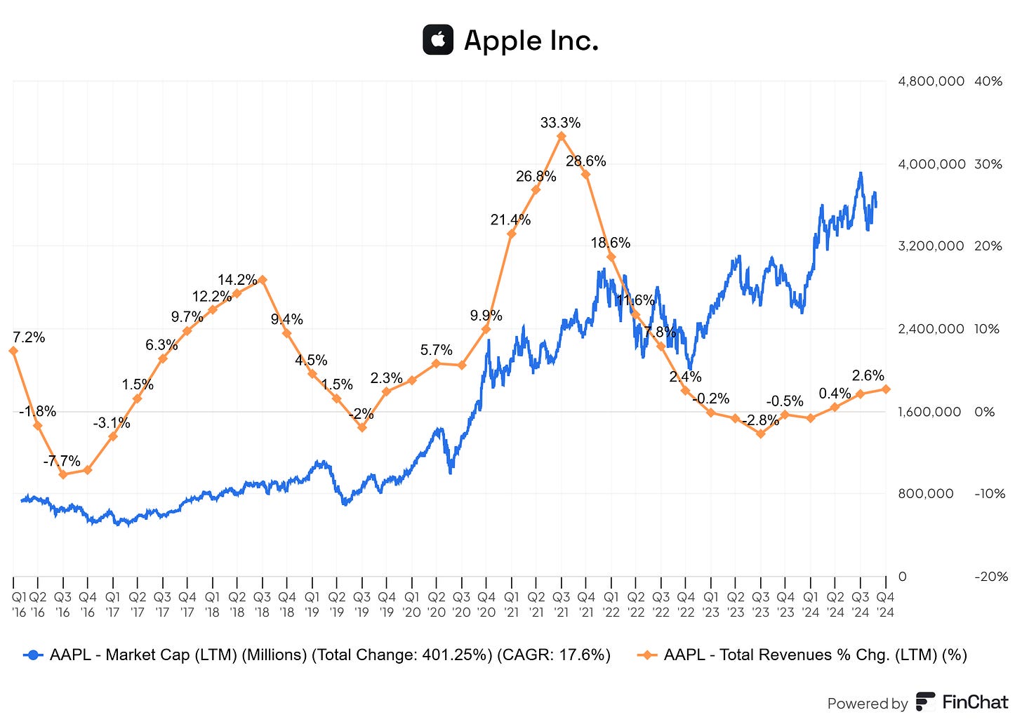 If Apple wants to grow revenue by 10% next year, it would need to add about $40 billion in new sales. That's roughly the size of a Fortune 100 company!