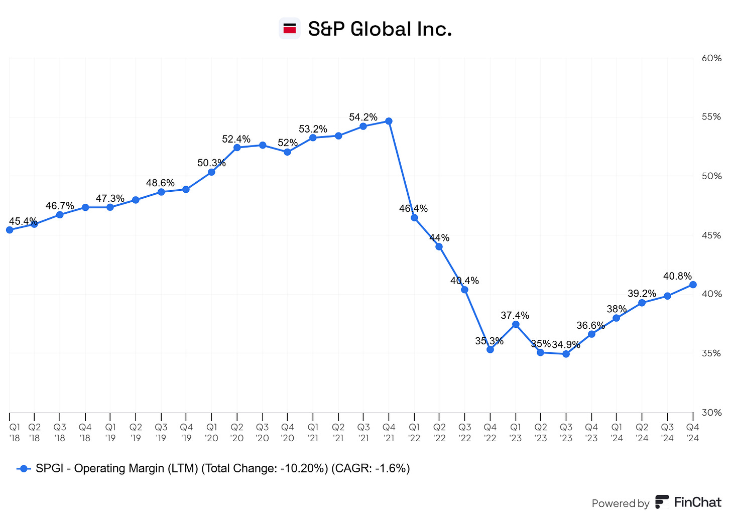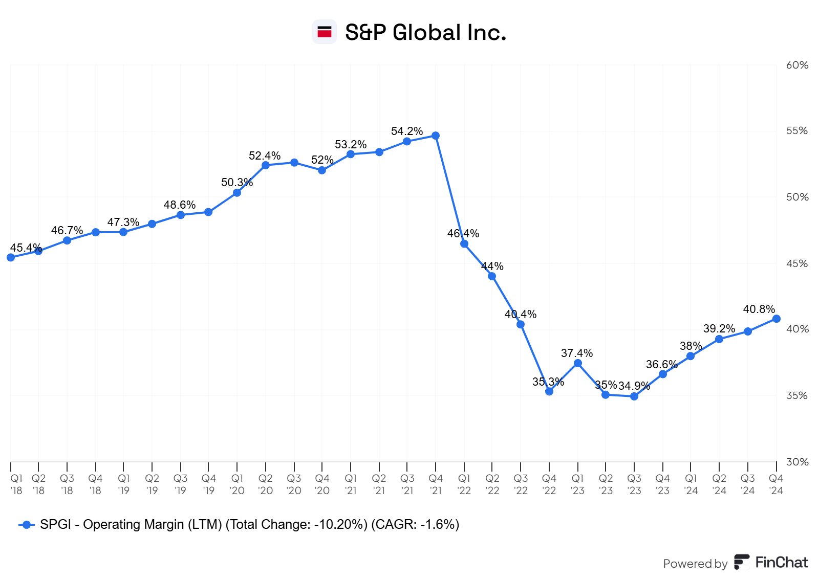 Looking at the fundamentals, S&P Global has been growing revenue at 5-7% on average in recent years, with margins around 47%.